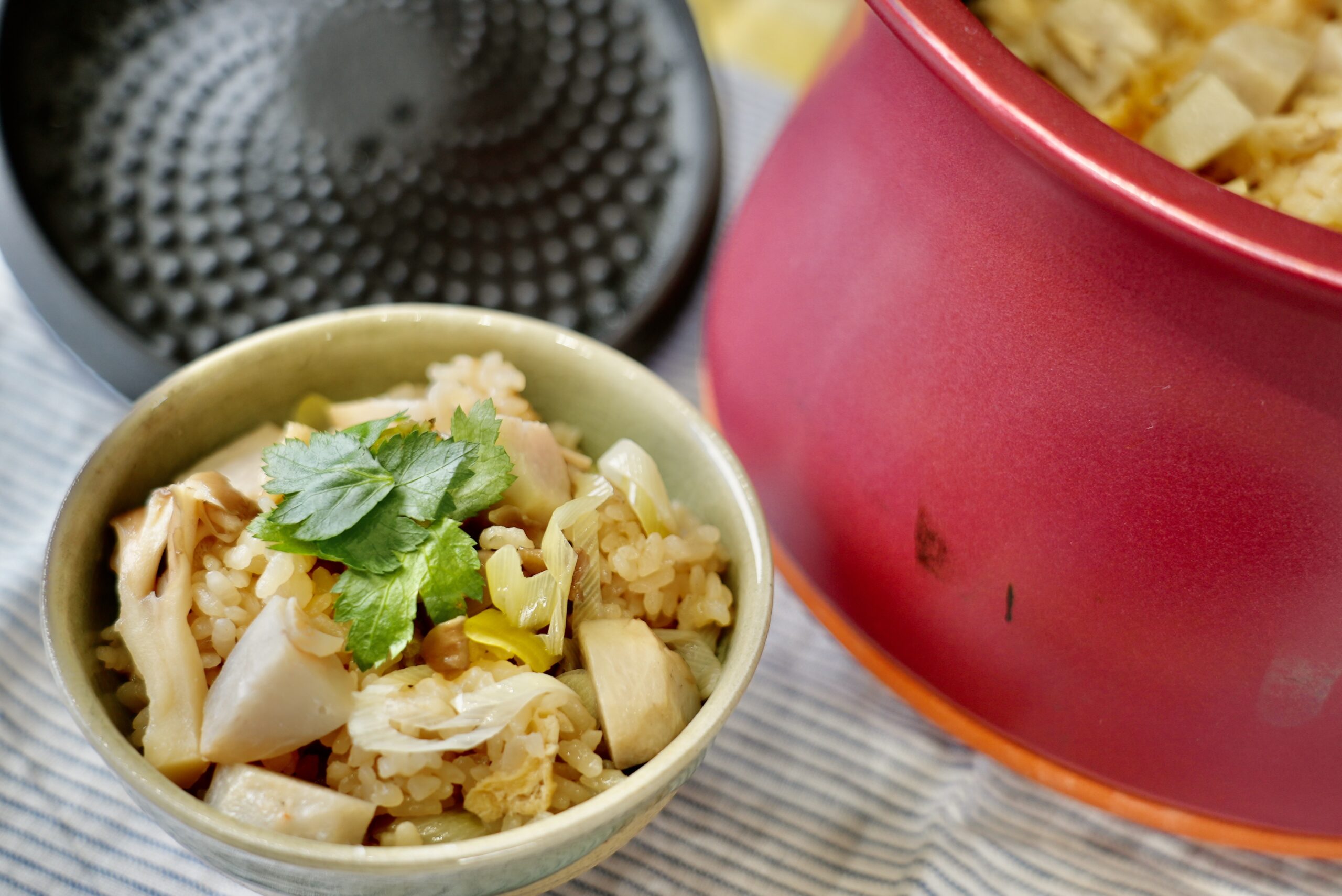 - ②ベストポットにお米、水、Aを入れて軽くかき混ぜ 里芋、舞茸、油揚げ、長ネギを蓋をします。