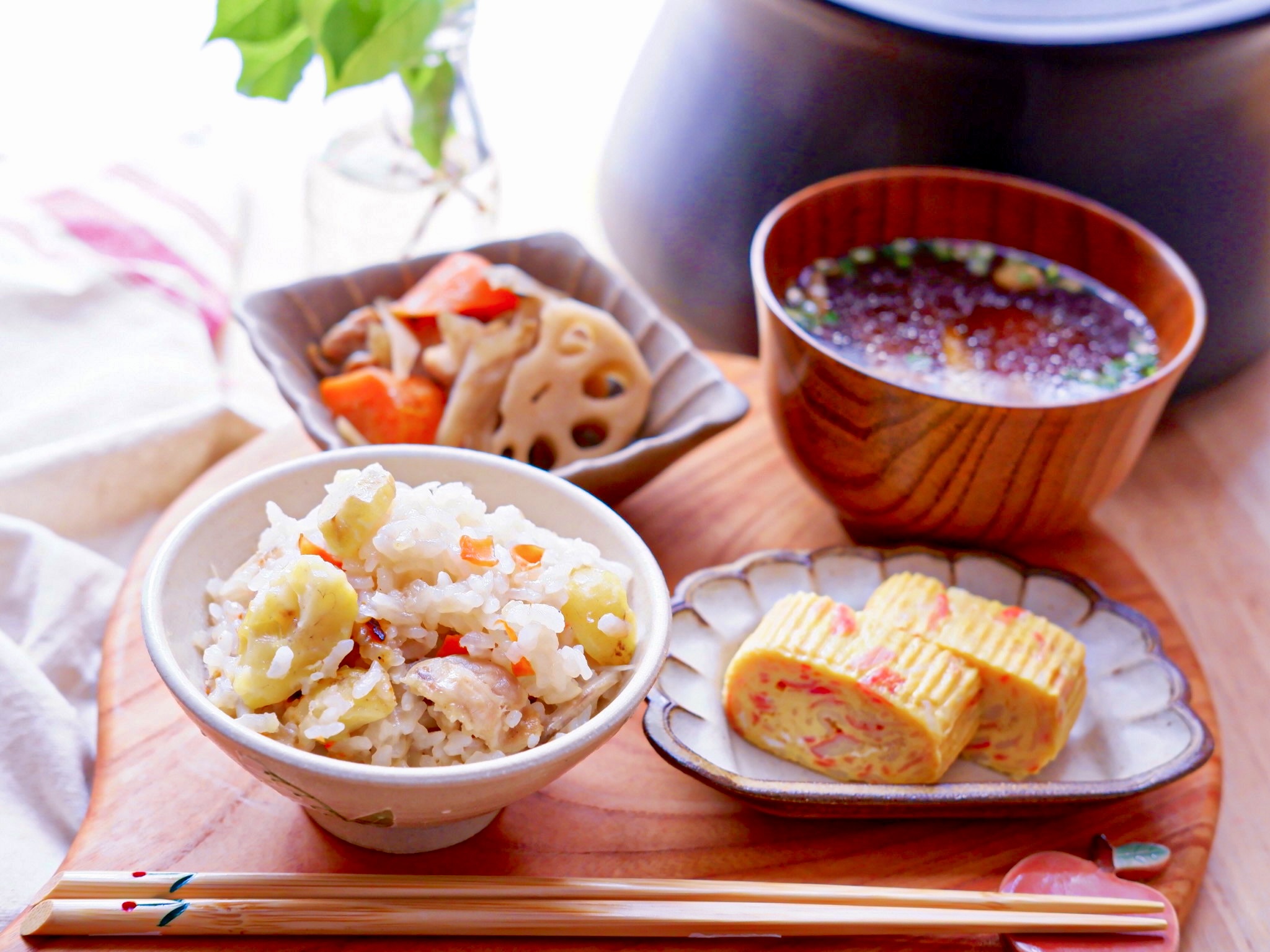 - ①<下準備>栗は一晩冷凍庫に寝かせたのち、熱湯に5分ほどおいてから皮をむきます。ごぼうは笹がきにして水にさらします。にんじん、油揚げは短いせん切りにします。椎茸は石づきを取ってスライスします。鶏もも肉は食べやすい大きさに角切りにします。米ともち米は混ぜて研ぎ、ザルにあげ水気を切ります。