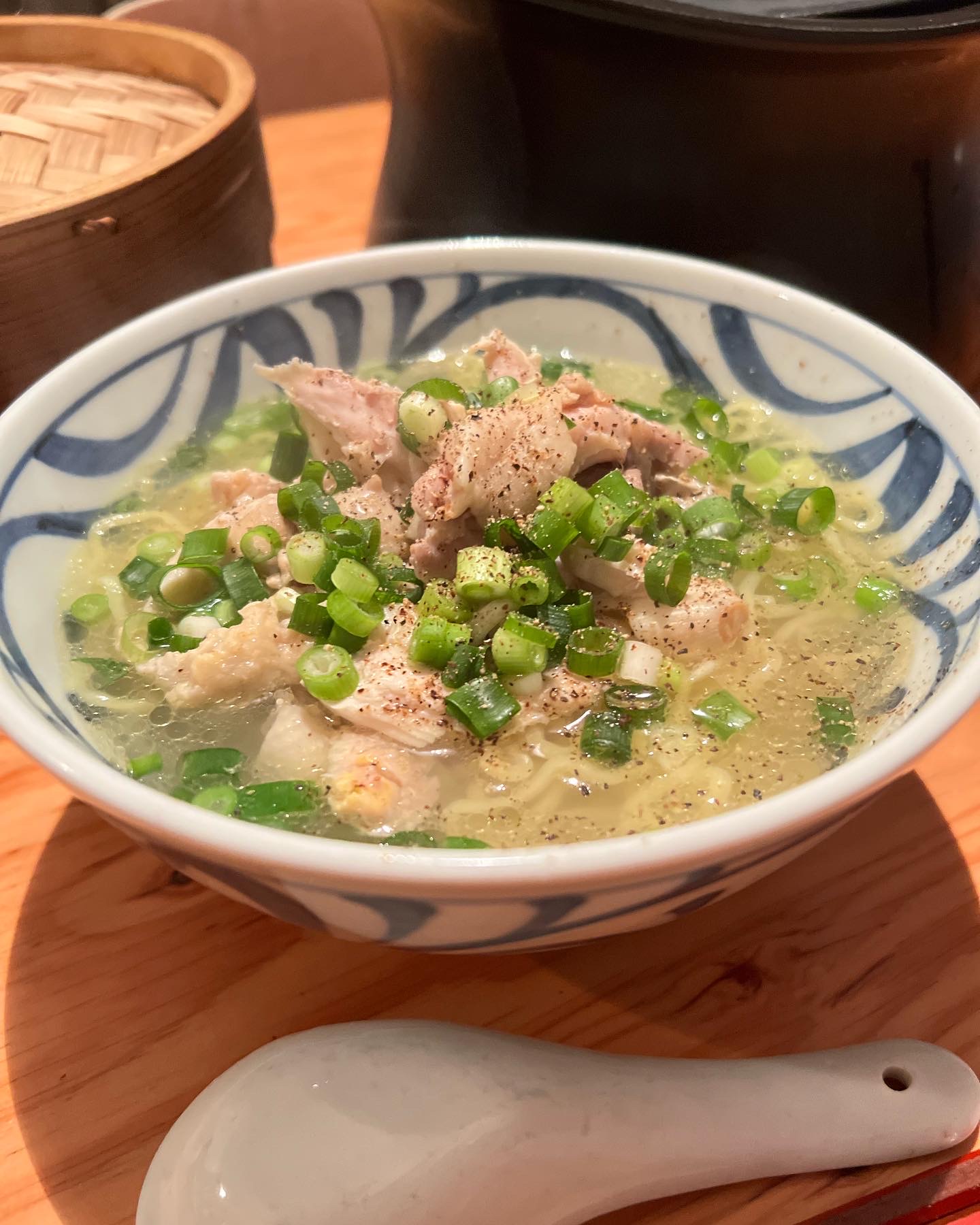 - ⑤中華麺を茹で、再加熱したスープとともにお皿に盛ったら、上から❹の鶏肉とネギ、そして胡椒をかけて完成です。