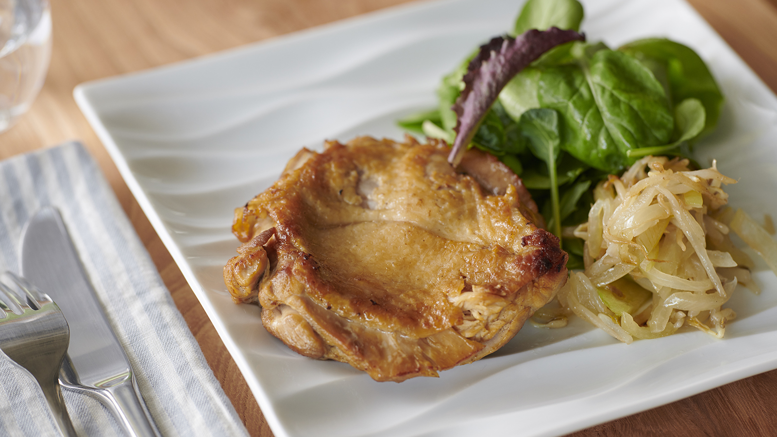 - ⑤ふたをして鶏肉の皮に焼き目がついたら裏返す。めんつゆで味付けしたらできあがり。またはお好みのソースで。