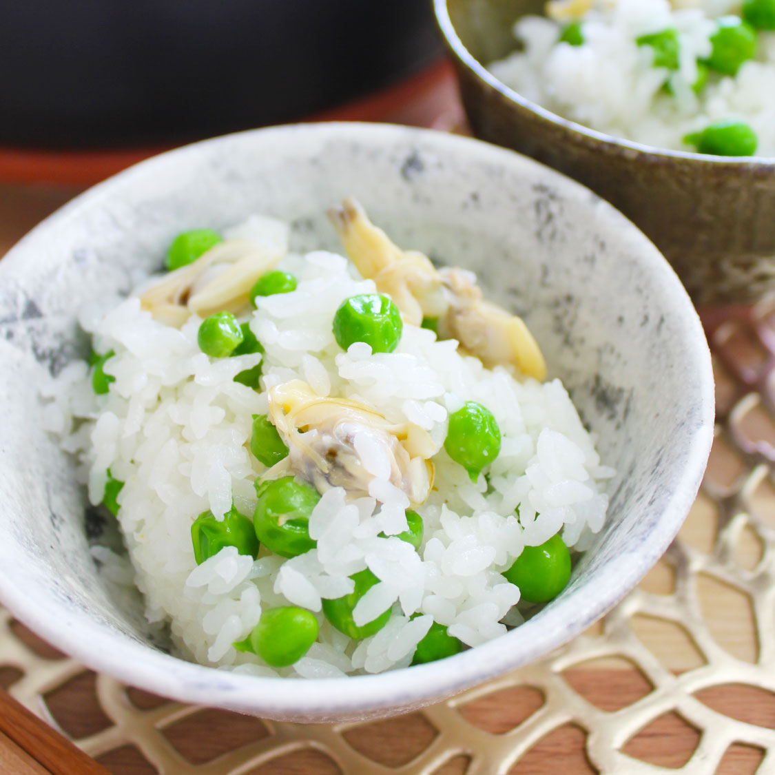 - ⑤蓋の隙間から泡が出てきたら火を止め、アサリとグリンピースを鍋に入れて15分蒸らす。