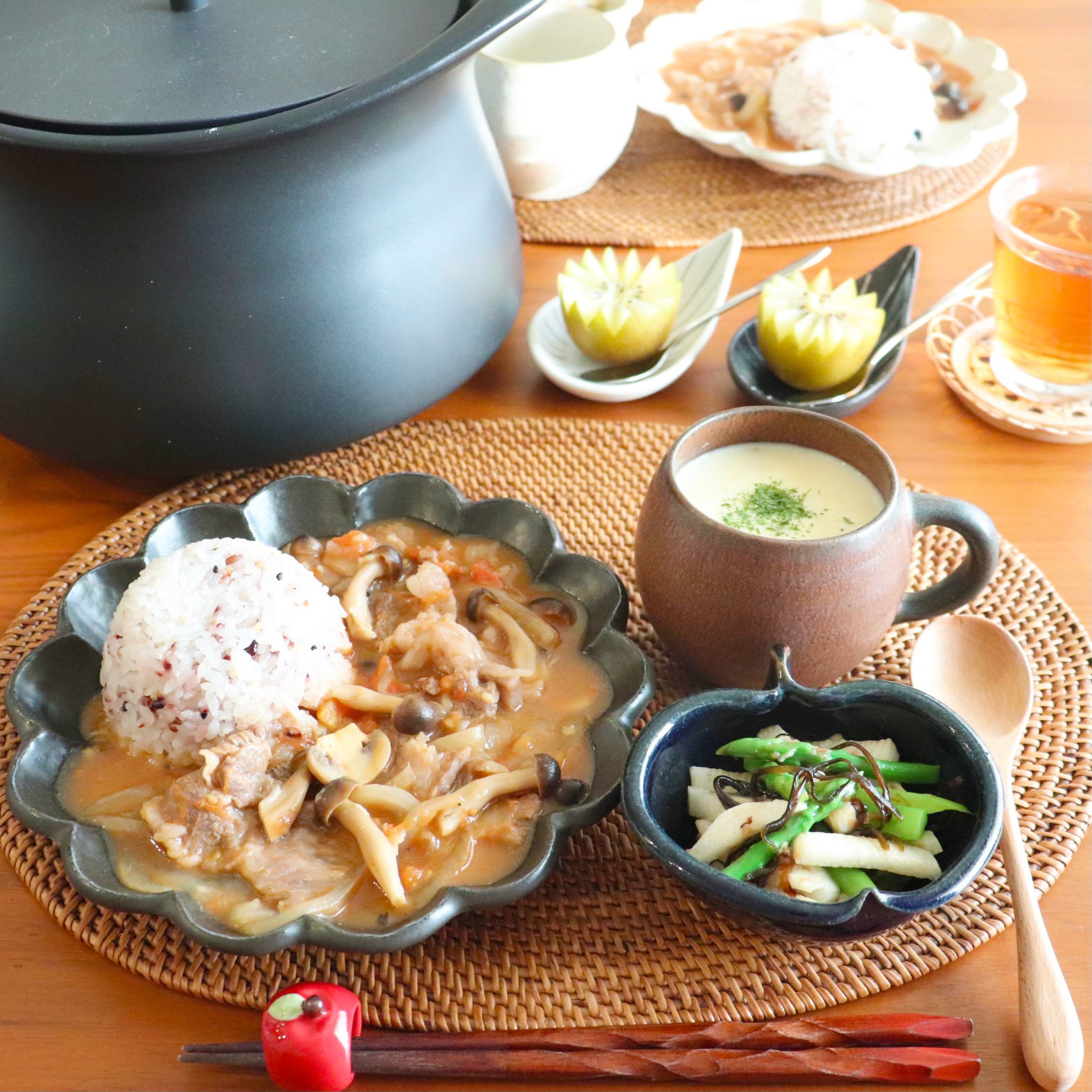 - ①bestpotに玉ネギ半量→マッシュルーム&シメジ→残りの玉ネギ→トマト→牛肉の順に入れて中火にかけます。