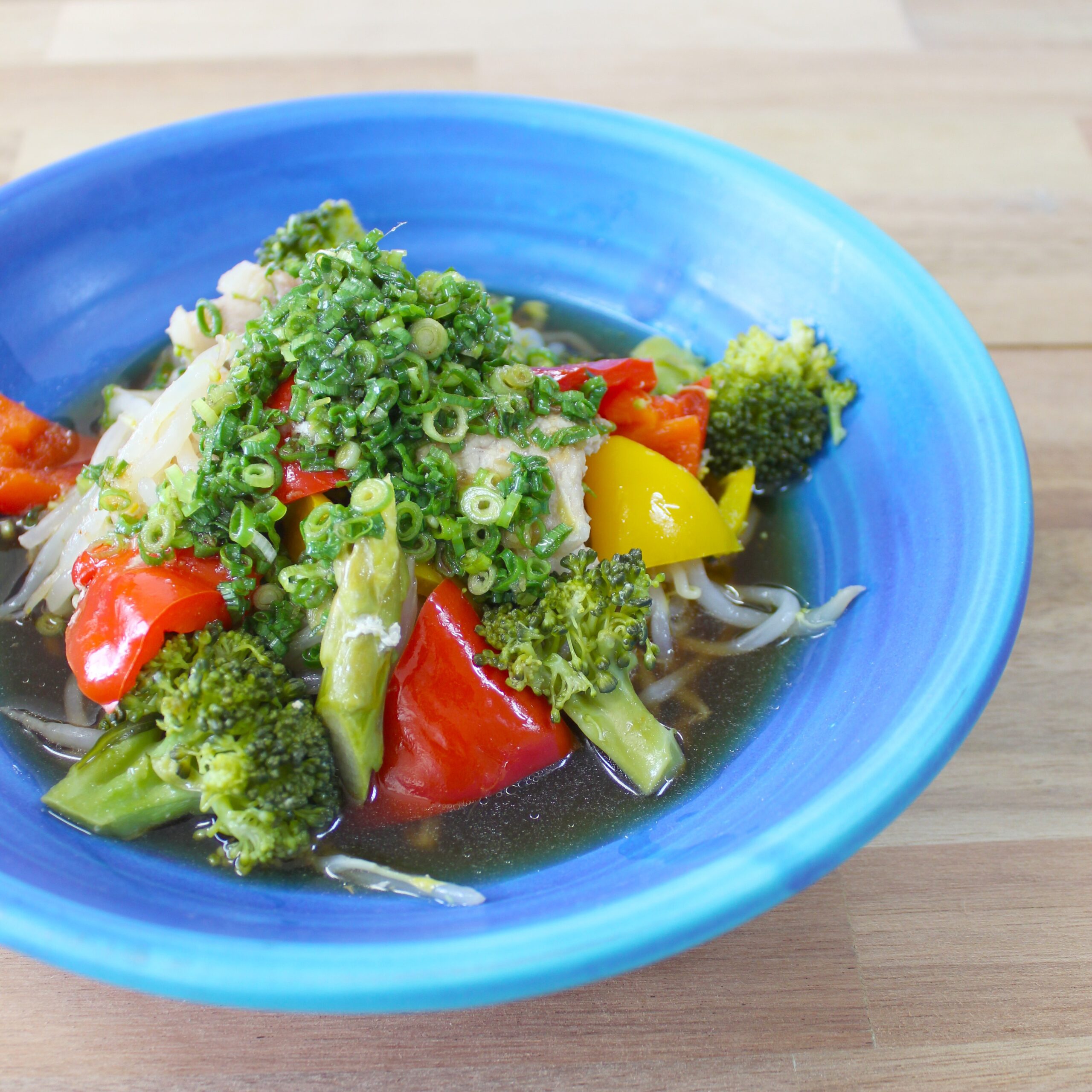 - ①ブロッコリー、アスパラガス、パプリカは大きめにカットする。