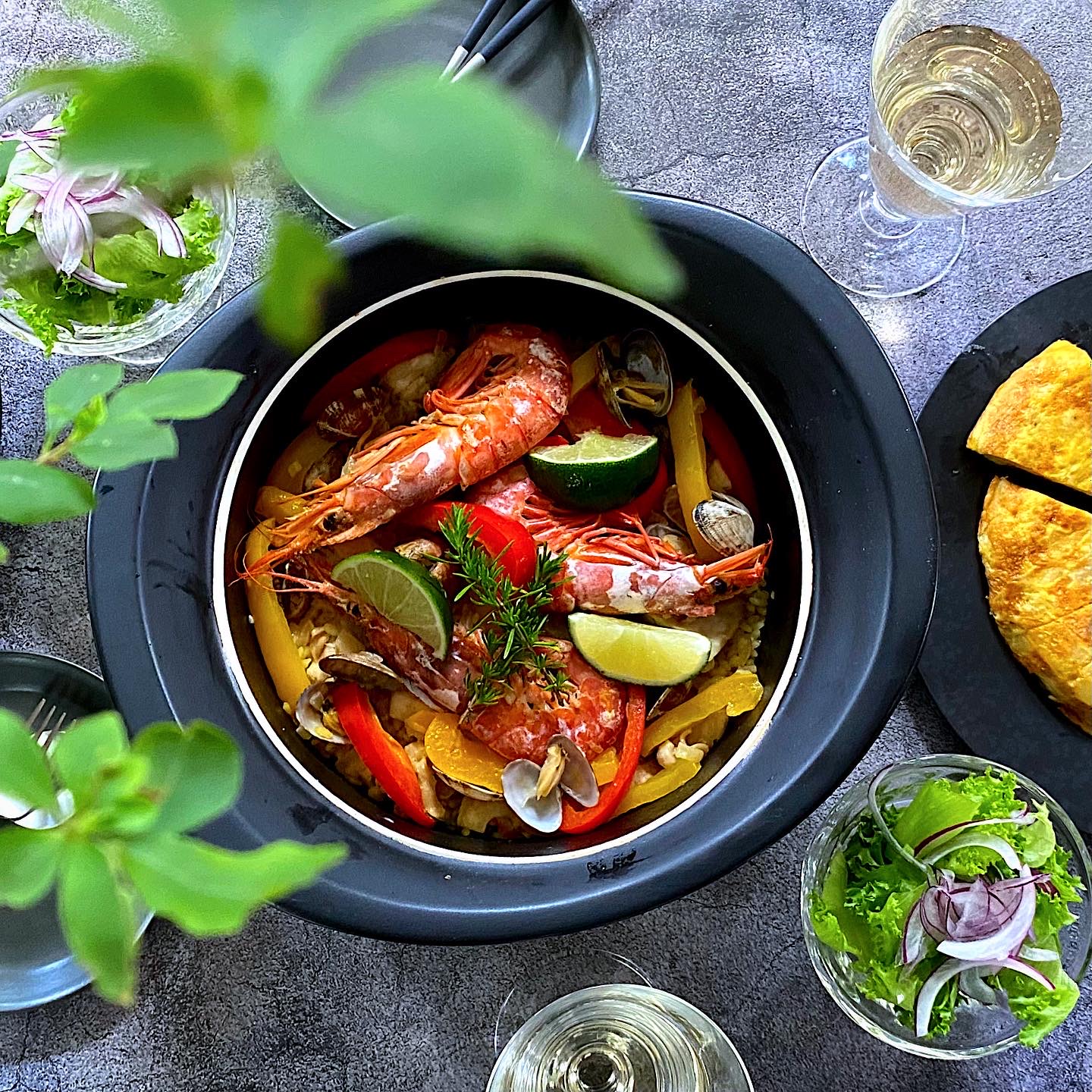 - ③★のスープとトマトを加えて混ぜたら、有頭海老、あさり、たら、②の鶏肉を入れて蓋をし、強火にかけて沸騰したら火を止めてパプリカを加える→15分以上置いたら完成!