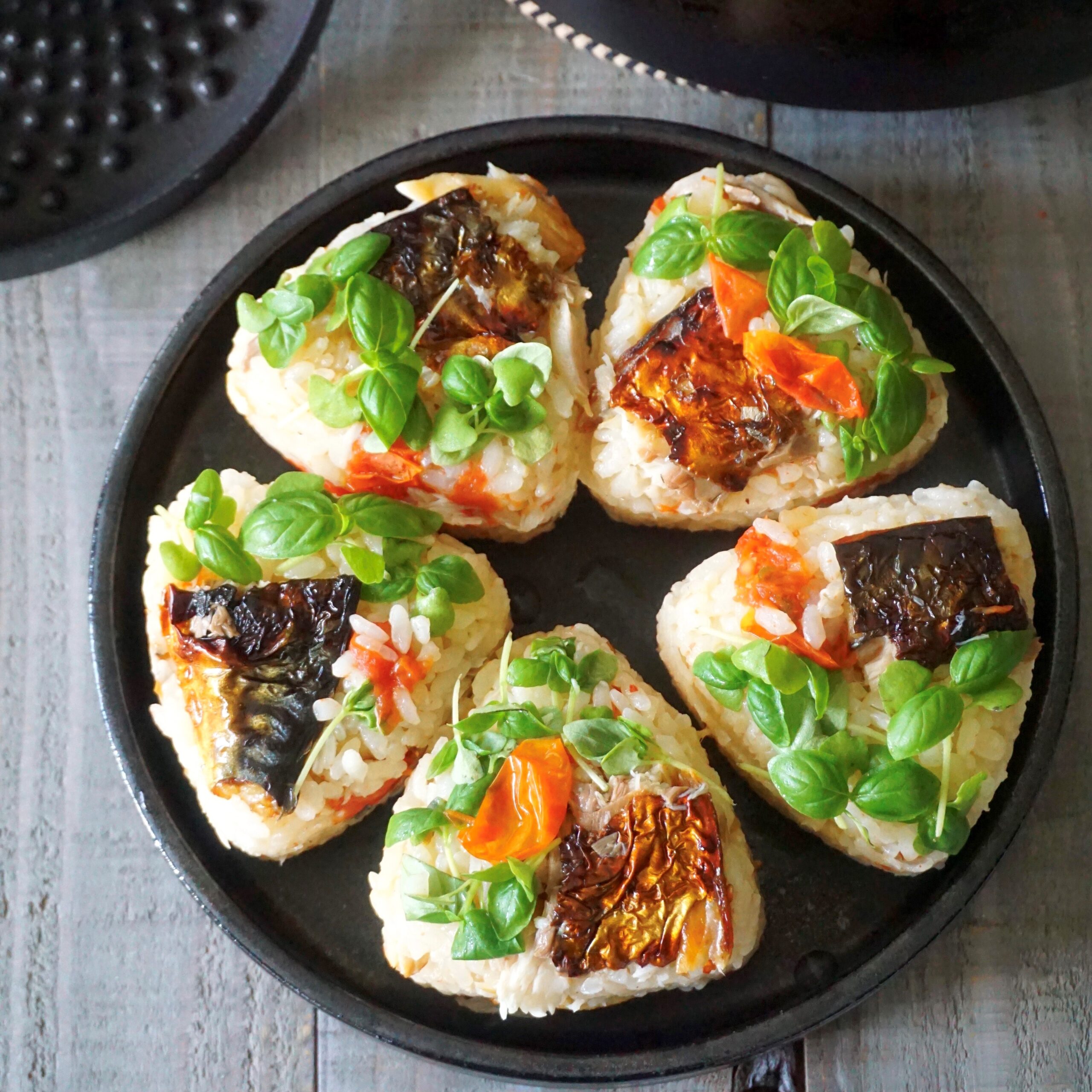 - ⑦半身のさばを10等分くらいに切り、 おにぎりの型に置き、サラダバジルを入れてからご飯を入れ、おにぎりを作る。仕上げに黒胡椒を振って完成!