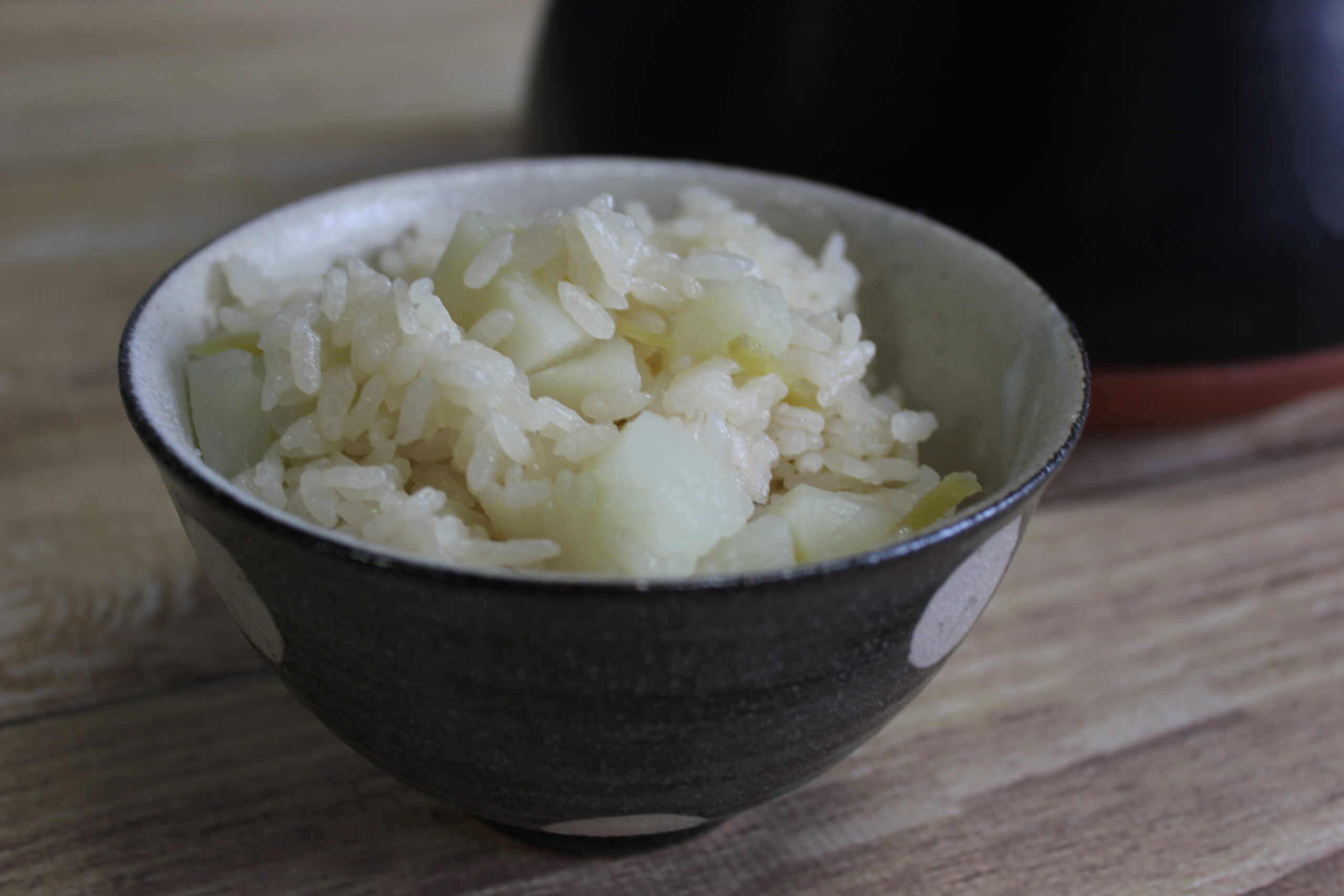 - ①〈下準備〉 ・米を洗い20分程浸水させる・菊芋を1㎝角の角切りにする・生姜を千切りにする