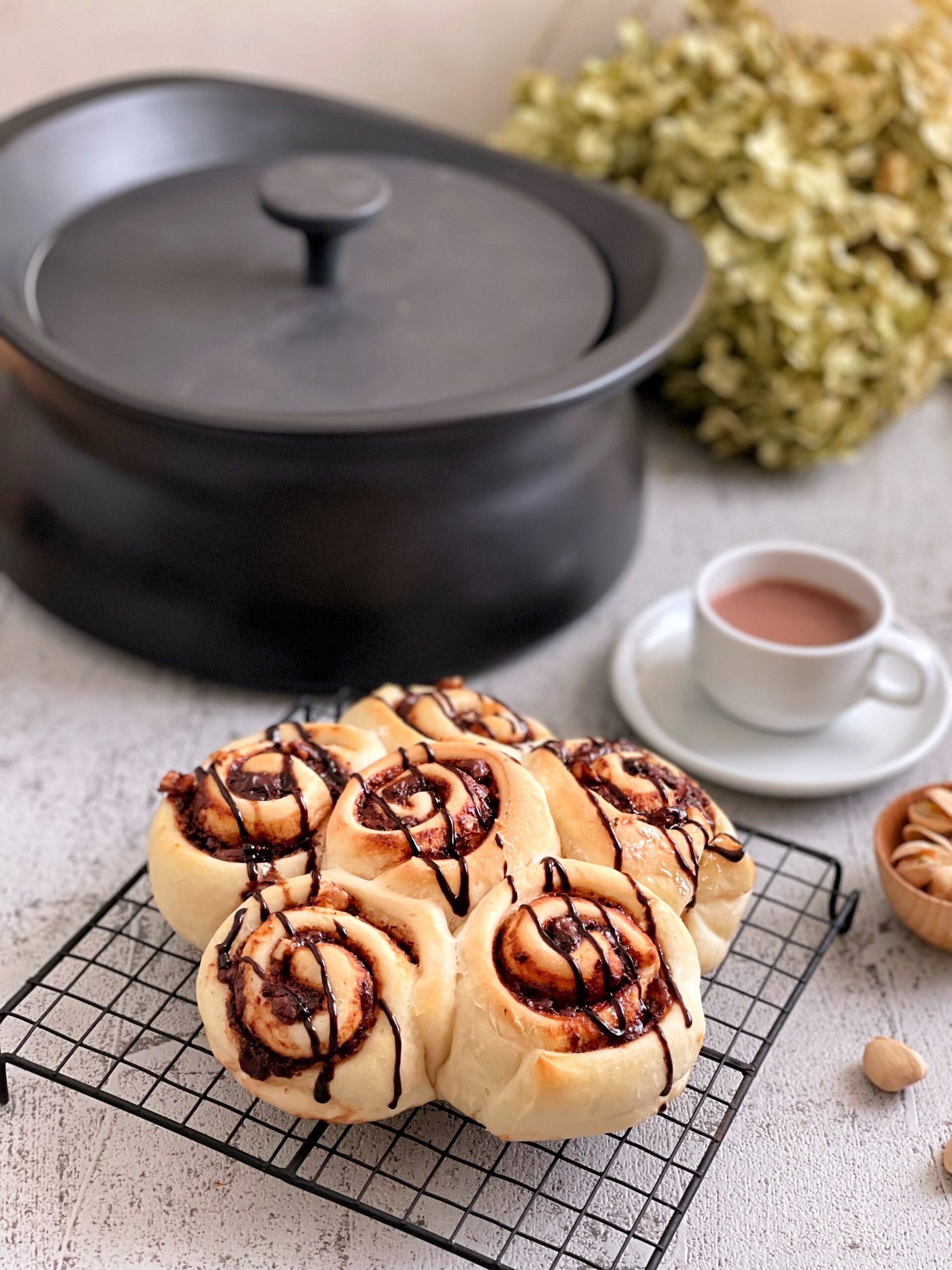 - ②生地の空気を抜いて、長方形にのばして、ヌテラ➡胡桃➡シナモンを振って、下からくるくる巻き込む。