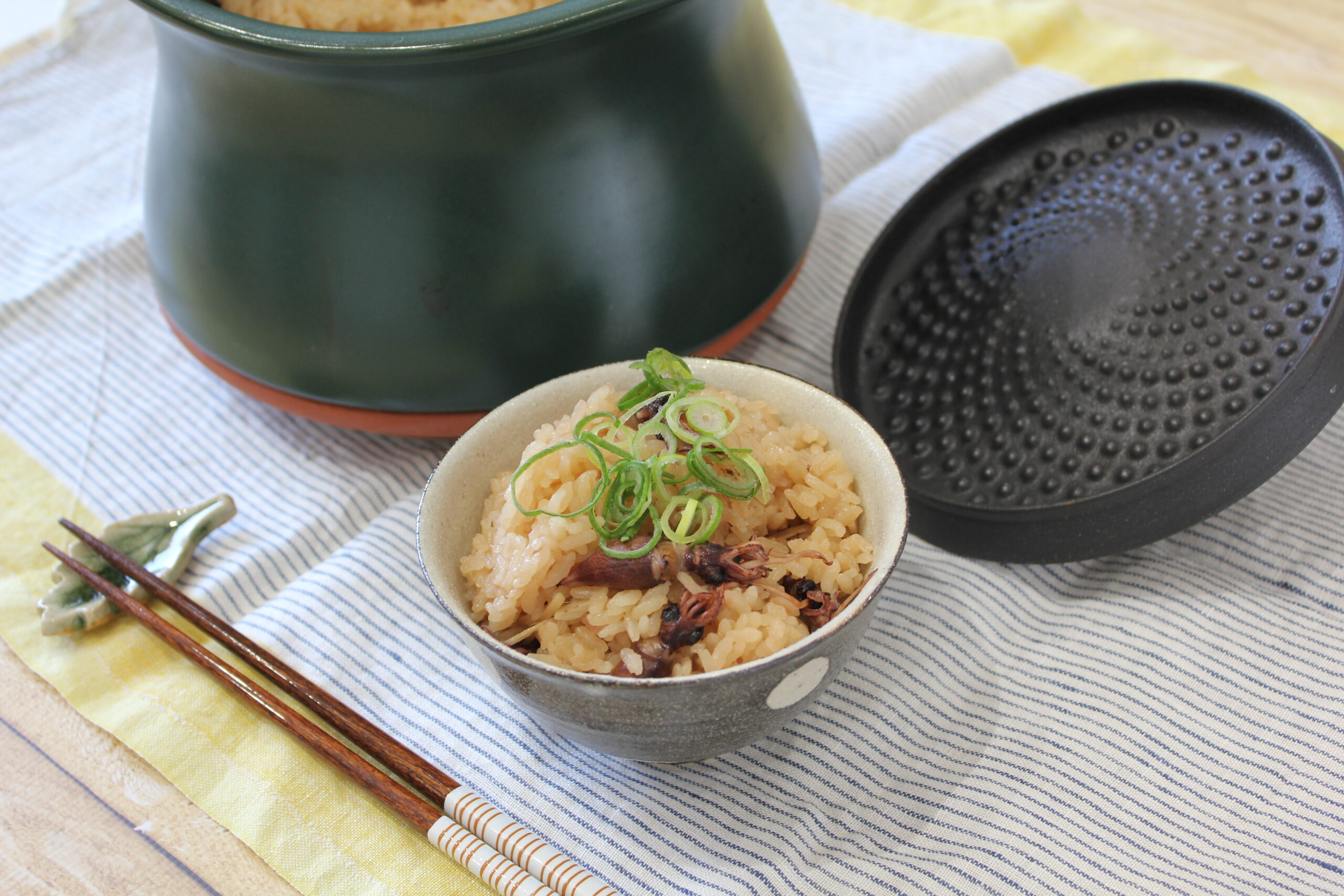 - ④鍋を蒸らし終わったら、ご飯を混ぜて茶碗に盛り付け、きざみねぎを散らしたら完成です。