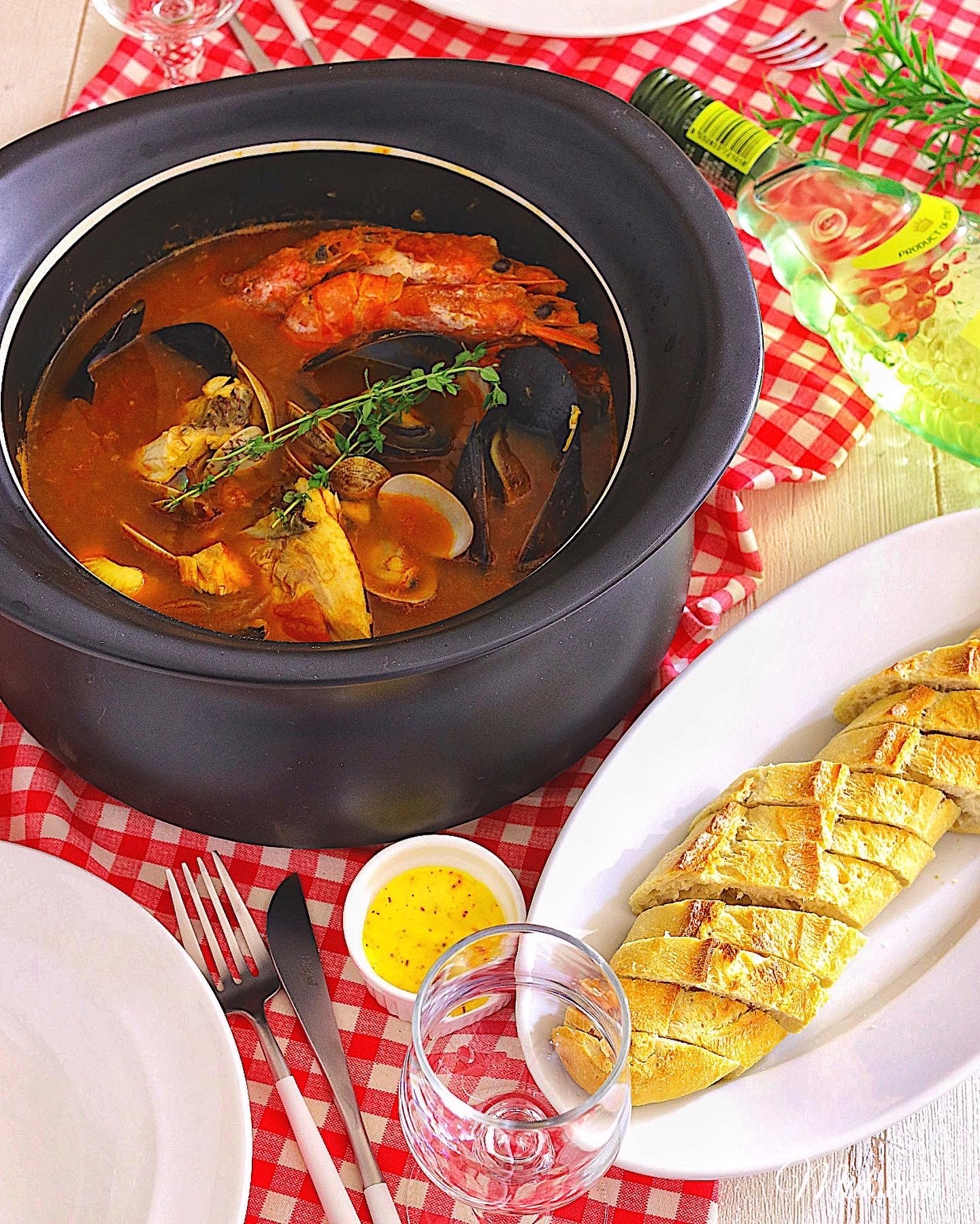 - ⑦ルイユを作ります。サフランをオーブントースターで軽く焼き(すぐ焦げるので要注意)キッチンペーパーに取り揉んで粉末にしたら、他の材料と混ぜたら完成です。バゲットにルイユを塗り、スープにつけていただきます。