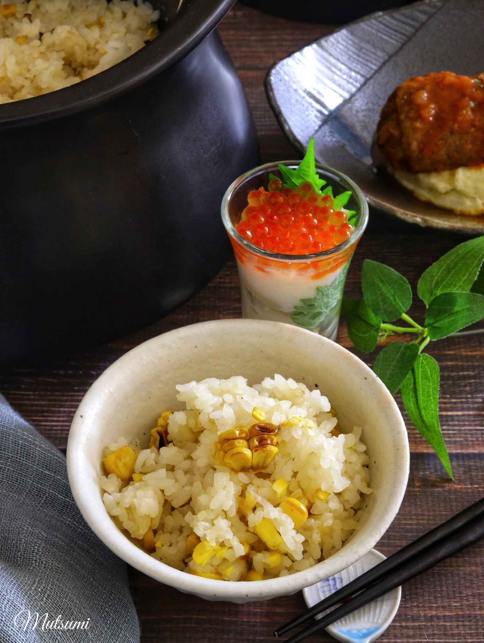 - ①〈下準備〉 ・米は洗って水気を切り20分置く。 ・とうもろこしは醤油とみりんを合わせたものを塗りながら、 魚焼きグリルなどで香ばしく焼く。(タレは使い切る) 粗熱が取れたら、実を削いでおく。芯も取っておく。