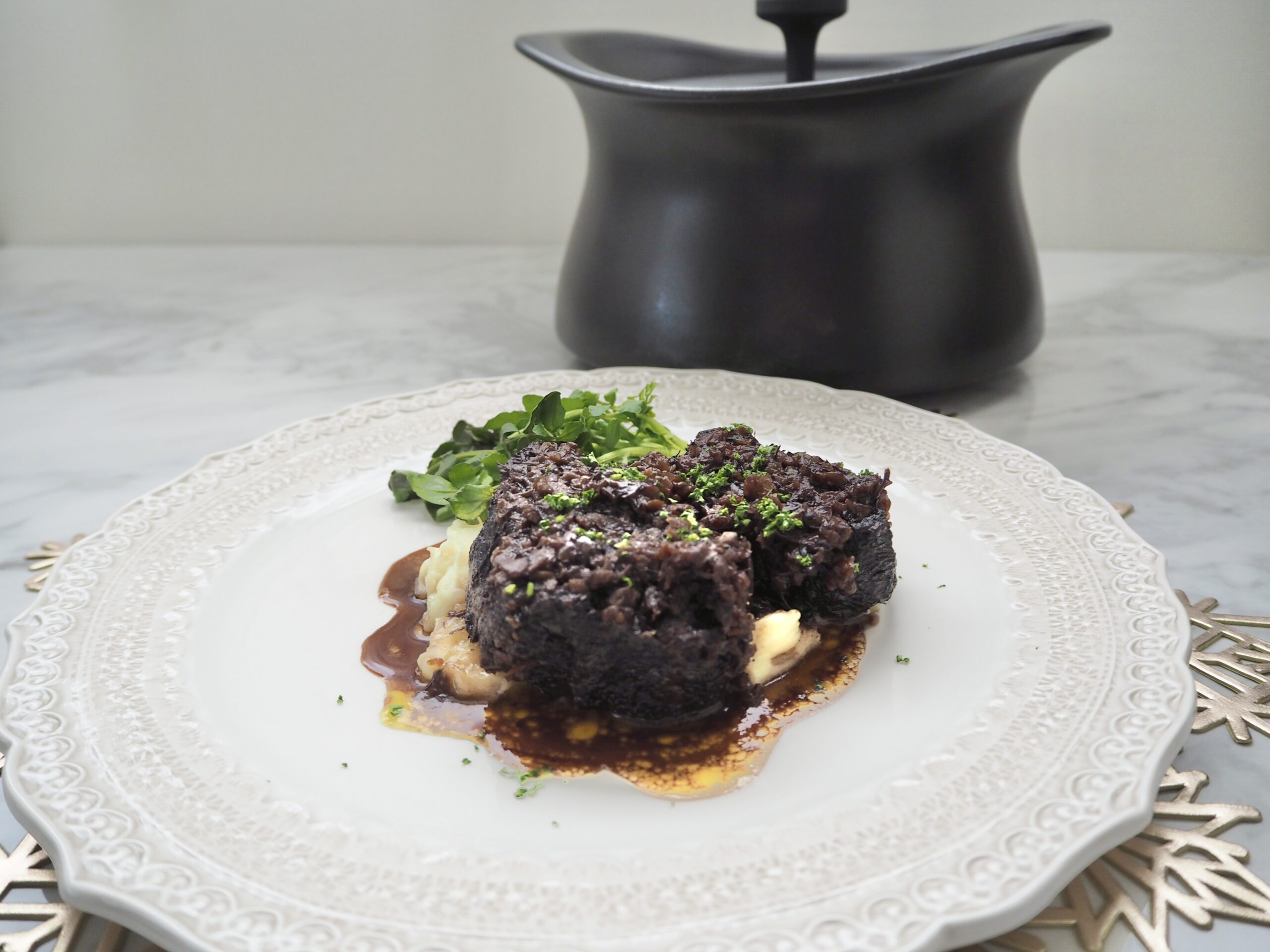 - ①〈下準備〉牛頬肉を100gずつに切り、赤ワインに漬けて冷蔵庫で一晩寝かします。