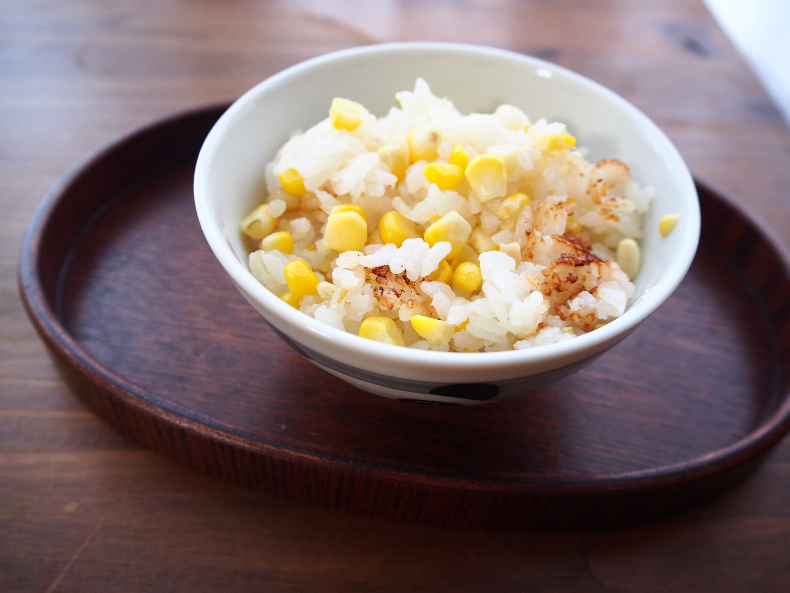 - ④②にトウモロコシの身と芯←お出しがでます!と、白だしを入れて蓋をして中火
