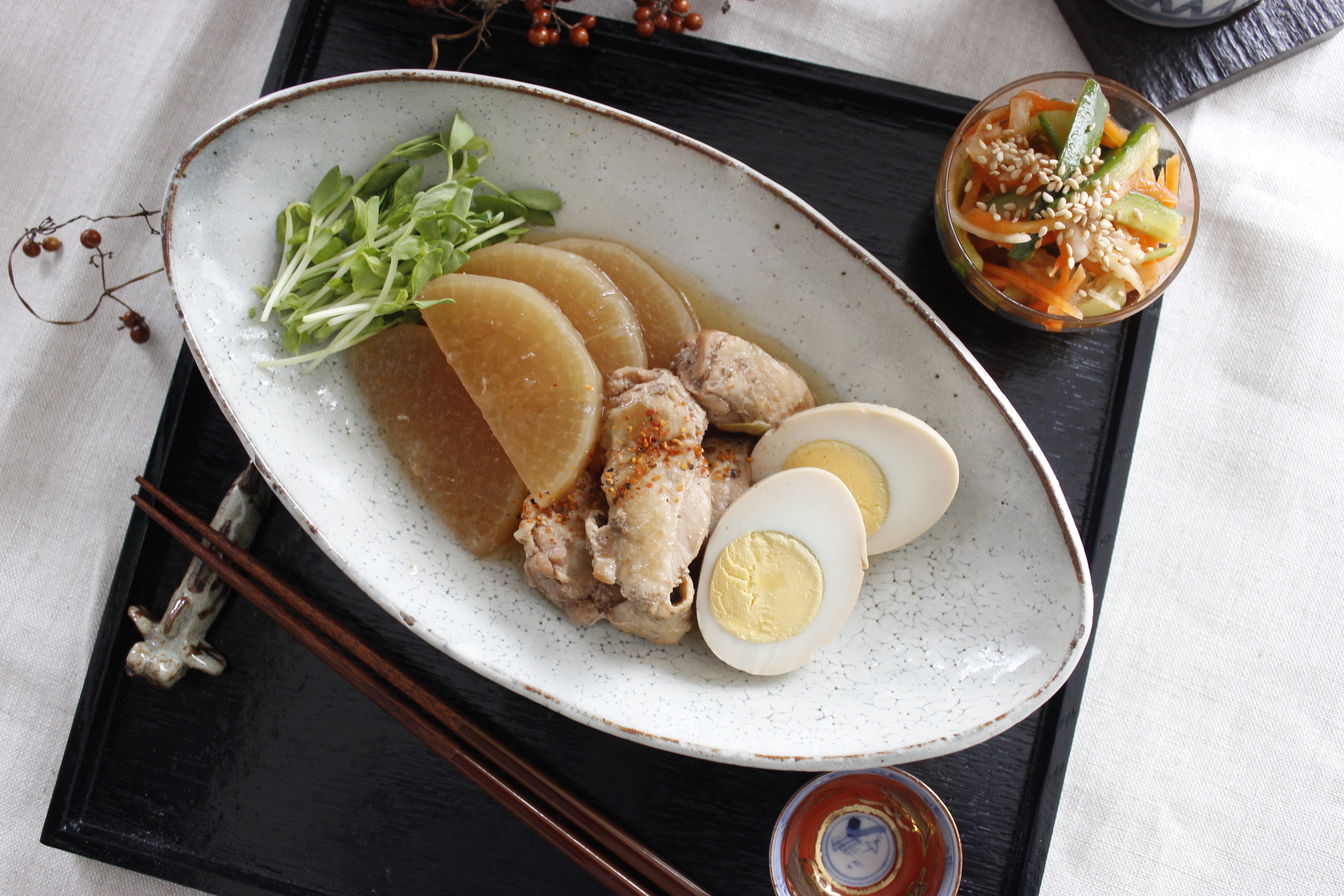 - ②火を止めそのまま放置(蓄熱調理)しておき、食べる前に蓋を取って汁を煮詰めながら 絡めながら温め直す。 器に盛り、緑のものを添え完成♪