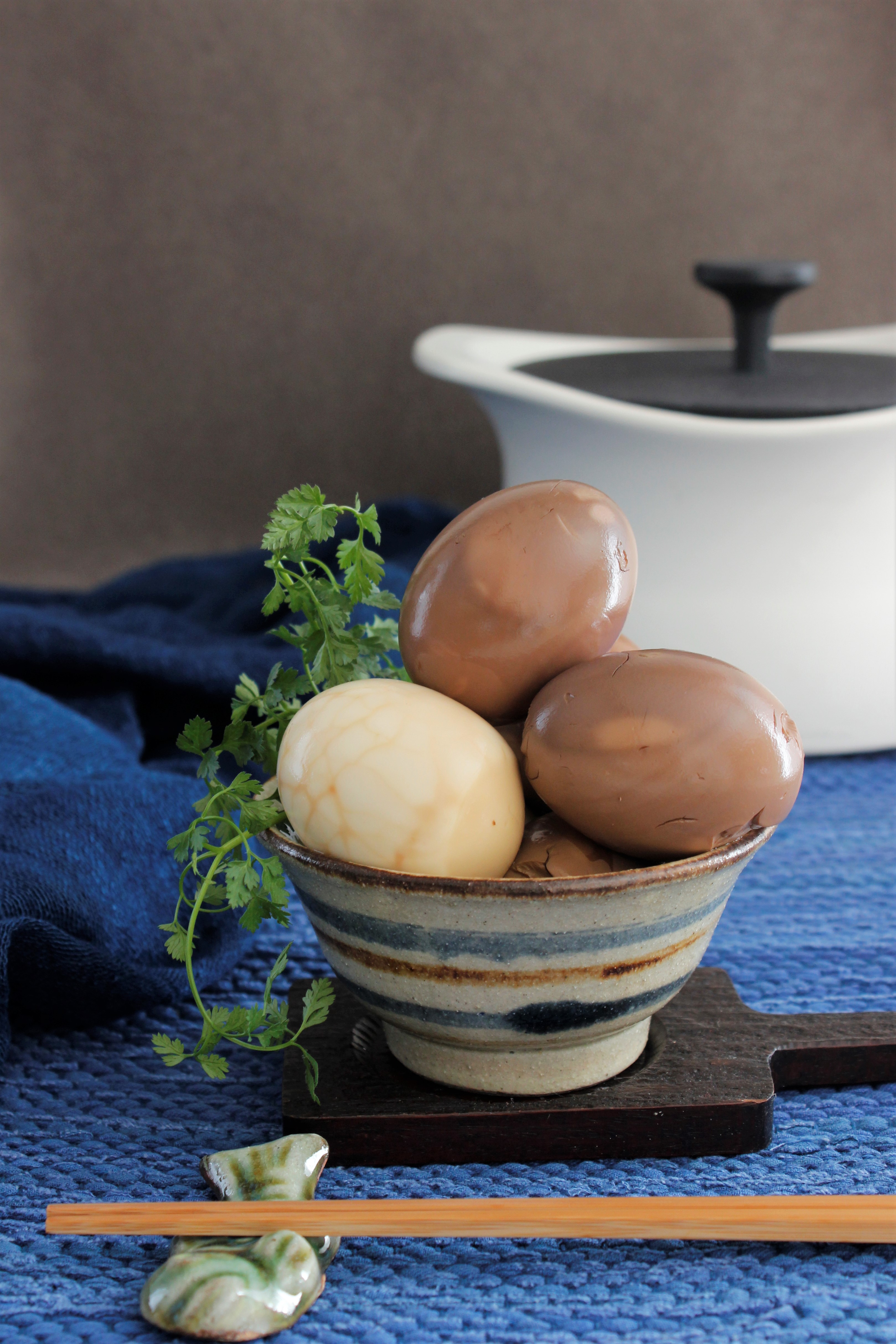 - ①茹でたまごは殻を剥くか包丁の背で細かくヒビを入れる