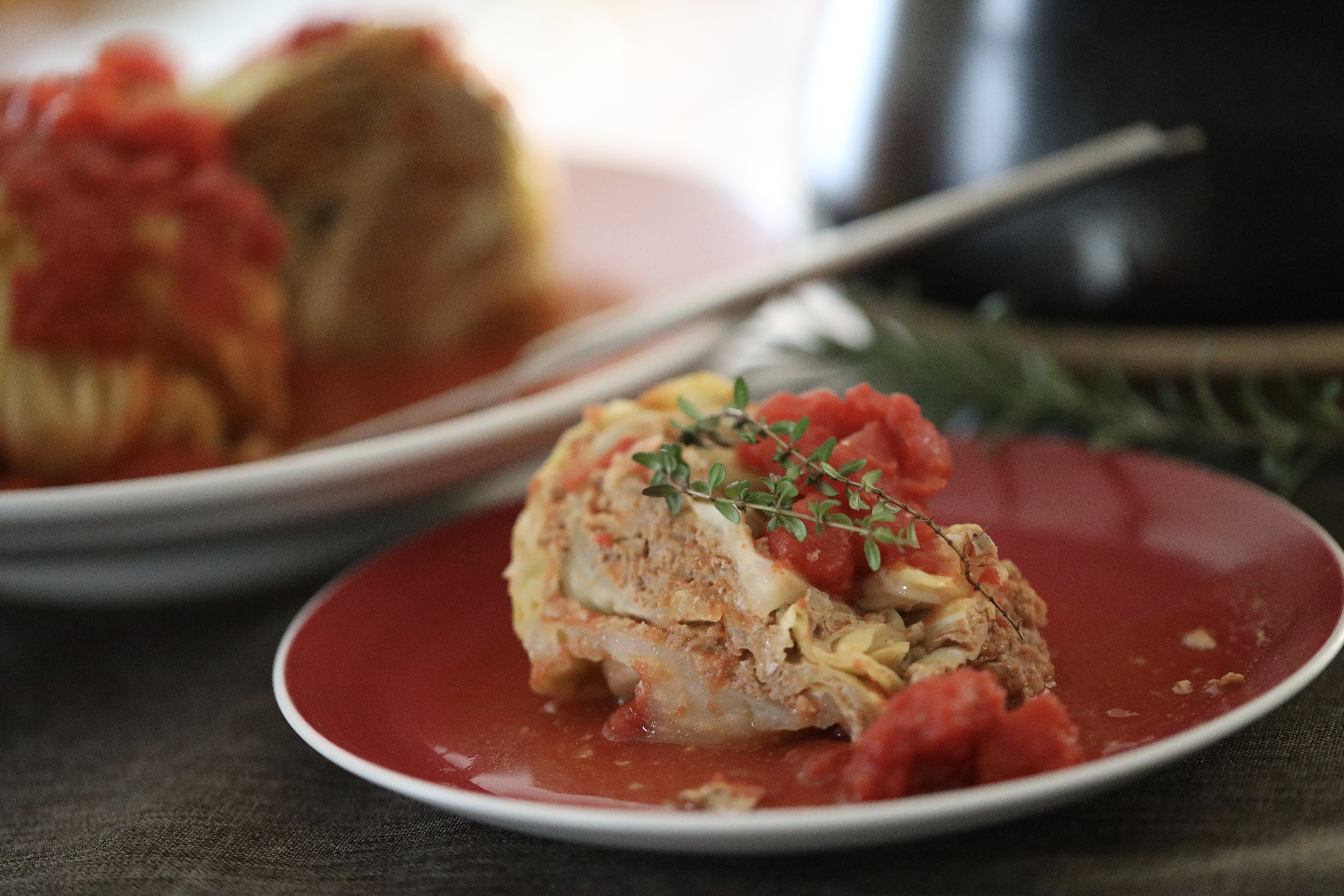 - ②春キャベツの中心になる葉を少し残しそこに肉を貼り付け、キャベツ→肉→キャベツと重ねていき最後はタコ糸で軽く結んでおく