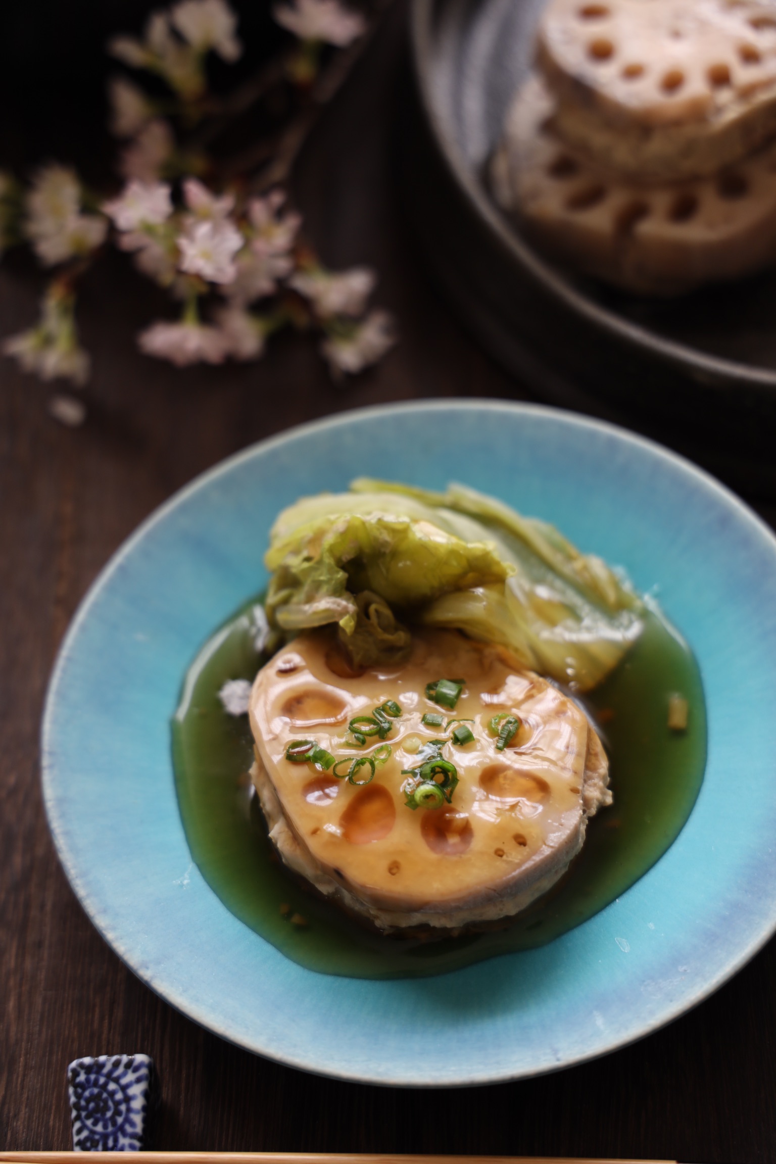 - ③②の上に白菜を置き、またその上にひき肉を挟んだレンコンを3個置く
