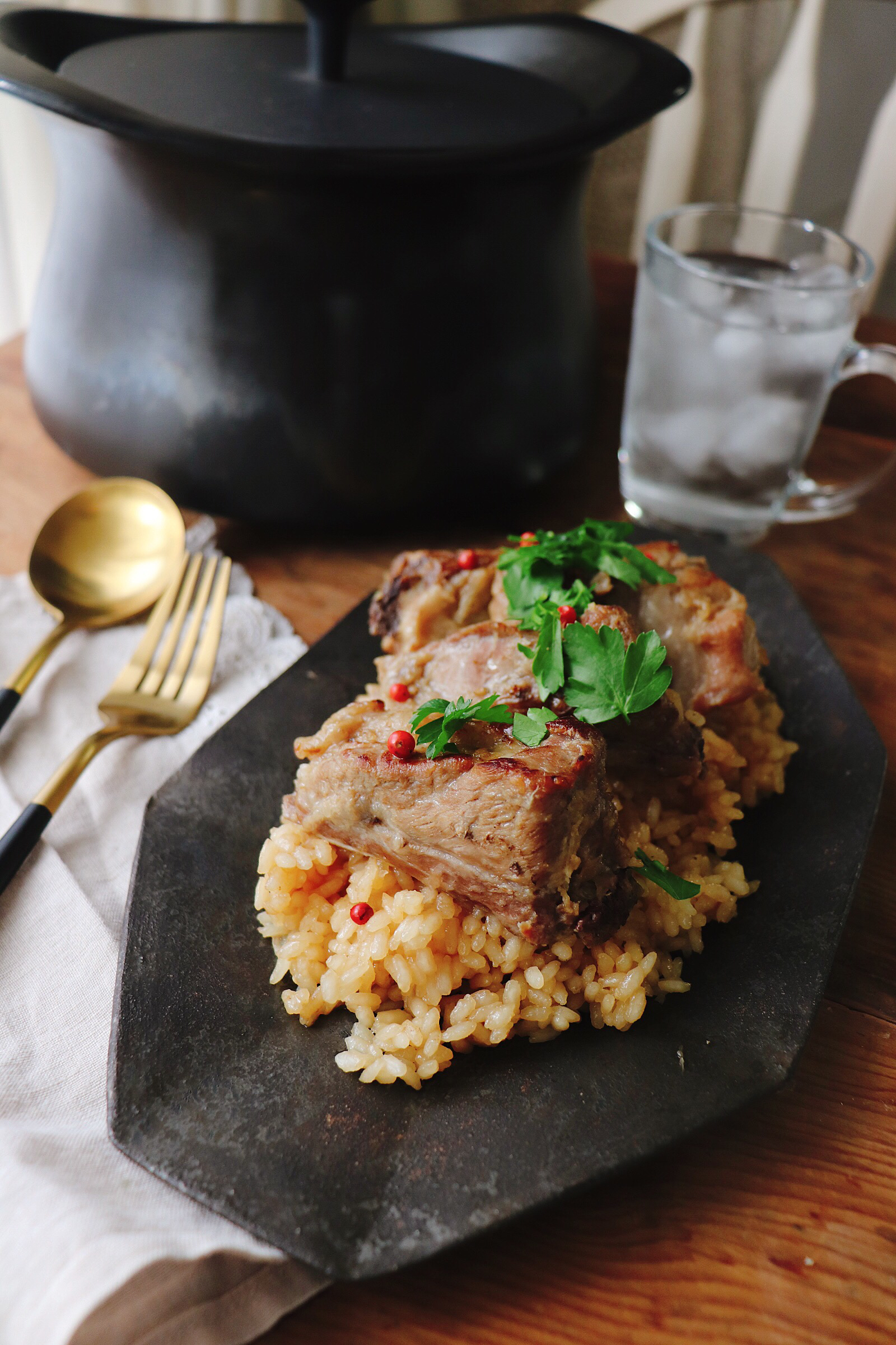 - ④浸水させてザルにあげたお米、①で焼いたスペアリブ、③の水をbest potに入れて蓋をし、火にかける。沸騰したら火を止め、15分蒸らして出来上がり!もしあればパセリとピンクペッパーをちらして完成です