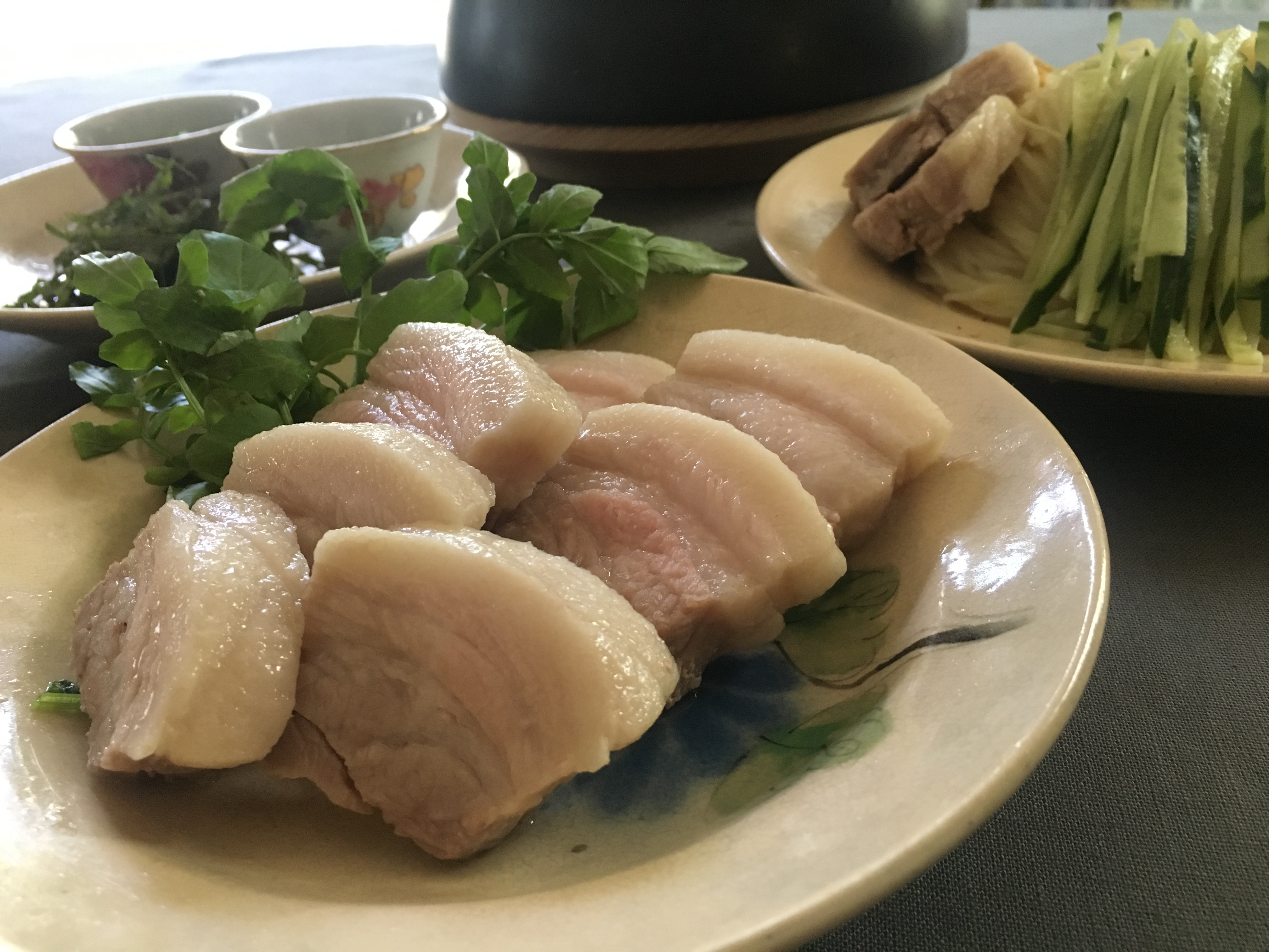 - ①ベストポットにお湯を沸かし、沸騰したお湯に袋ごと豚バラ肉を入れて、20分弱火で加熱。