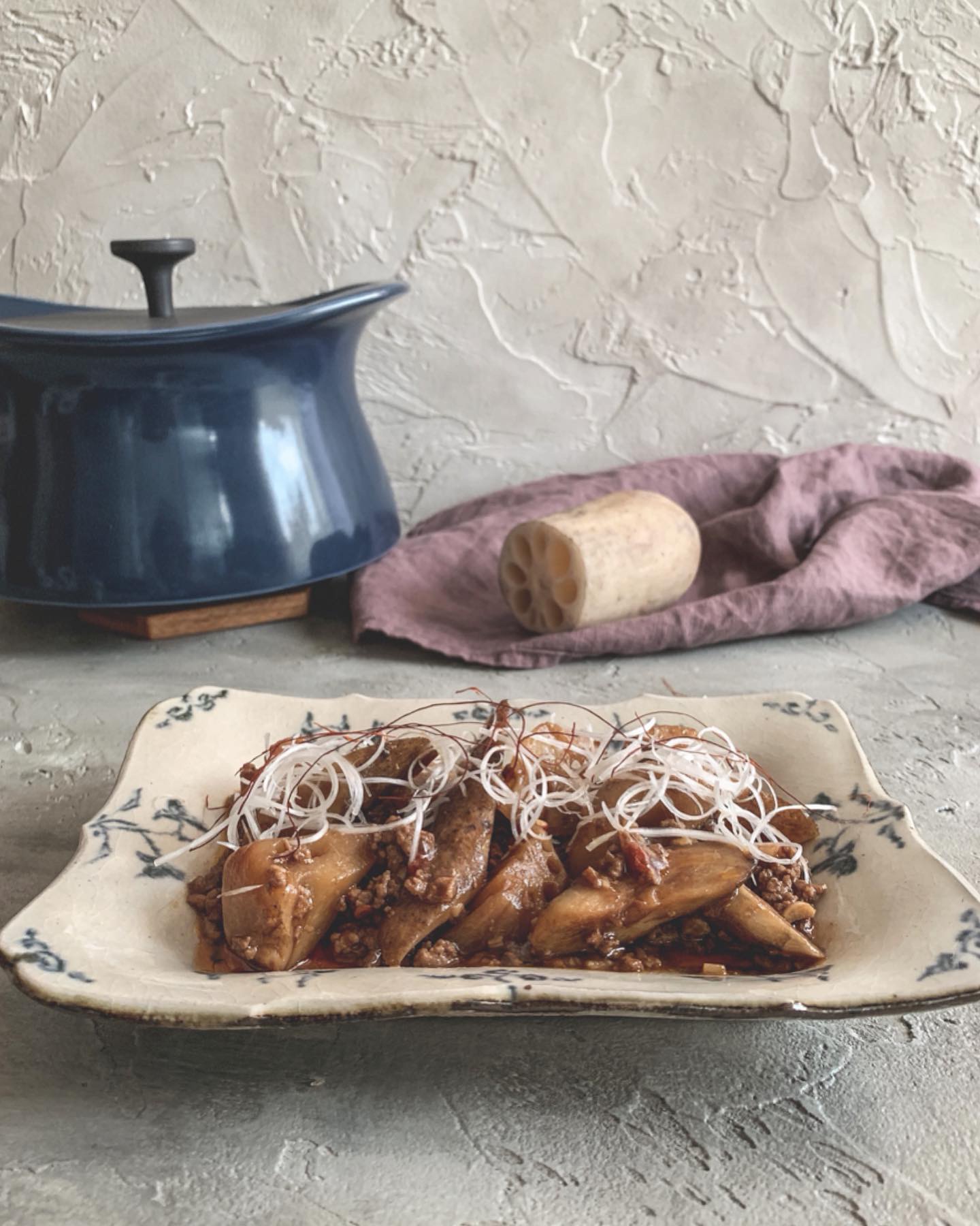 - ④.レンコンとゴボウの固さを確認し、味見をして必要があれば調え、水溶き片栗粉を加えて混ぜた後、再度火にかけて一煮立ちさせ、器に盛って白髪ねぎと糸唐辛子を添え出来上がり